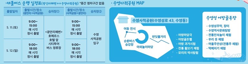 마당극 등의 공연이 이어지는 수영사적공원까지는 셔틀이 운행되고 있으니 함께 즐겨보는 것도 추천드립니다.