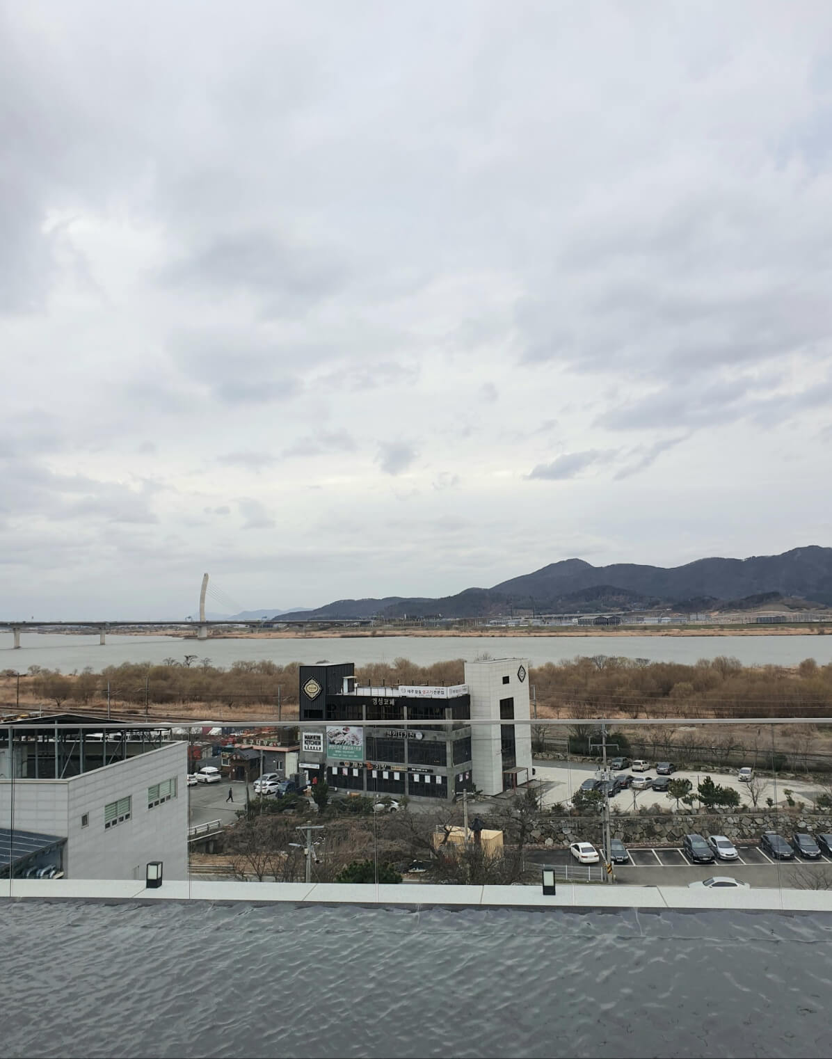 노키즈 존인 3층 루프탑의 모습입니다. 한치의 가림도 없이 확 트인 하늘과 낙동강 그리고 멀리 펼쳐진 산의 모습에 근심과 걱정이 확 날아가는 기분입니다.